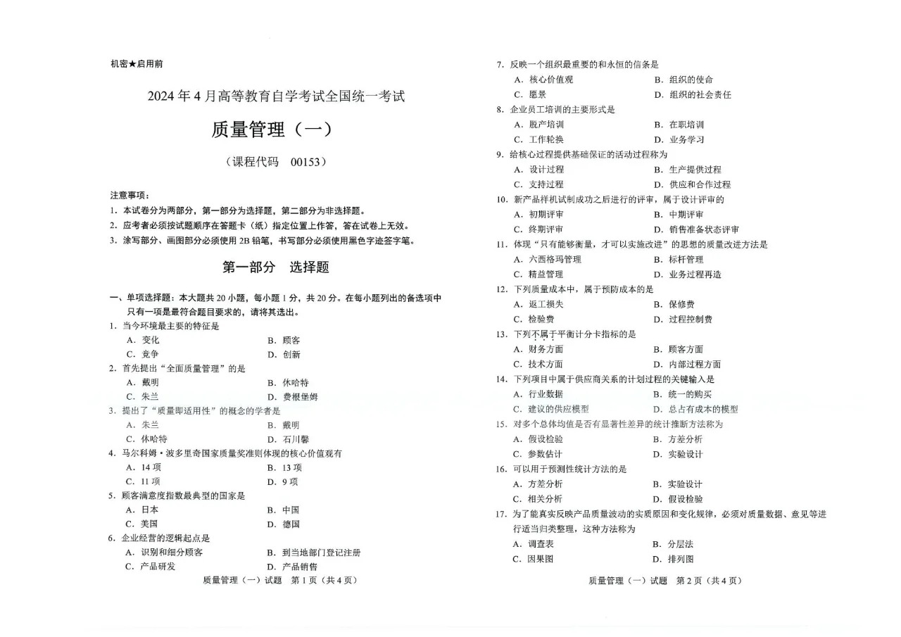 本文标签:重庆自考 00153 质量管理(一) 2024年4月重庆质量管理(一)自考真题