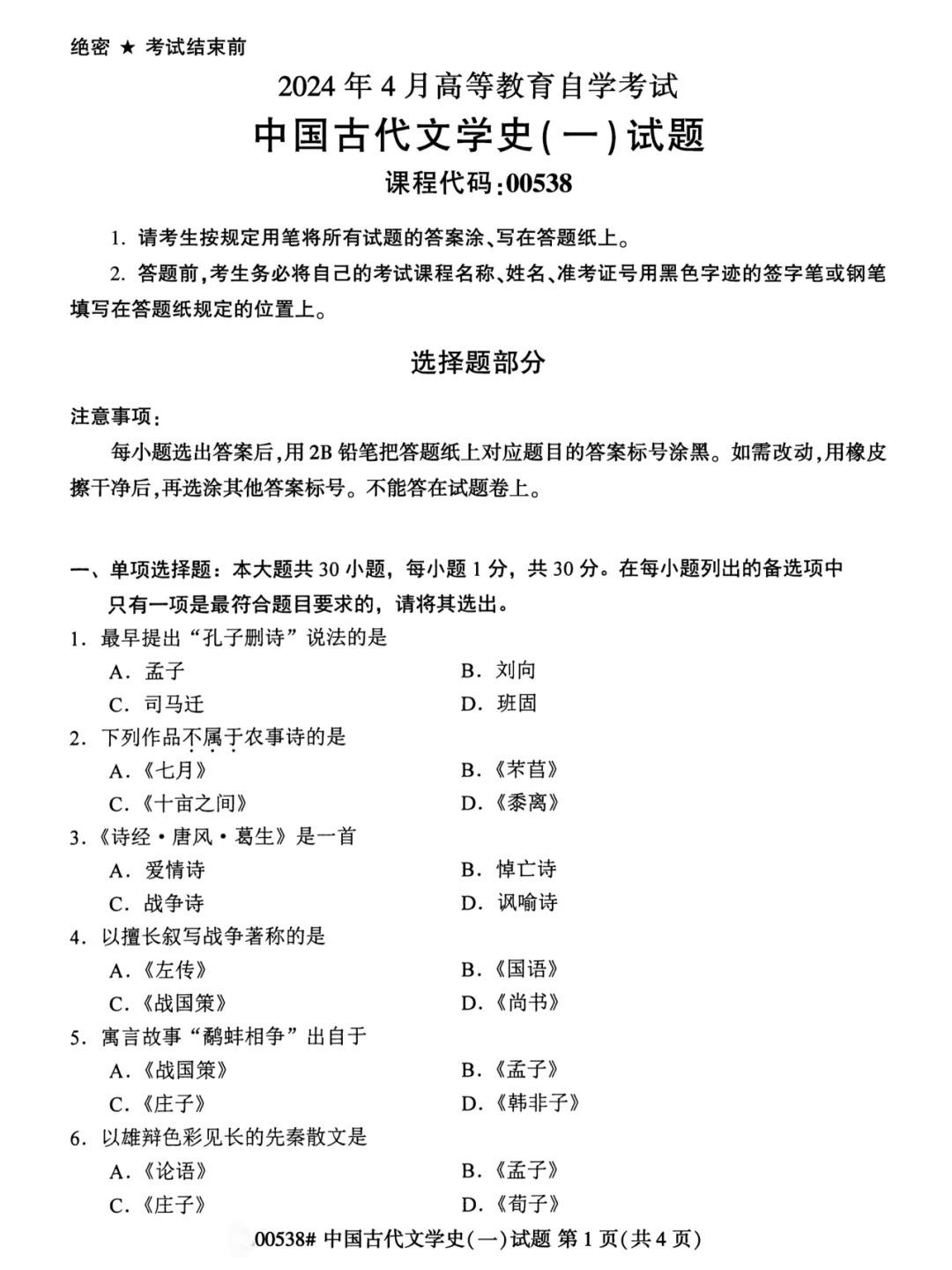 本文标签:重庆自考 00538 中国古代文学史(一) 2024年4月中国古代文学史(一)自考真题